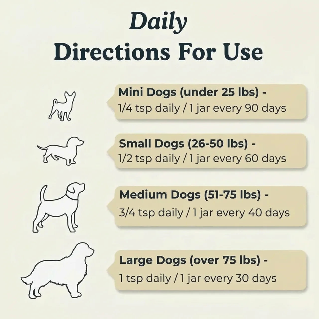Β½ scoop for dogs under 25 lbs. 1 scoop for 25β50 lbs. 1.5 scoops for 51β75 lbs. 2 scoops for 75+ lbs. Mix into food daily.